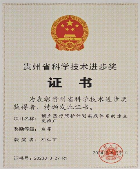 11月21日,贵州省科学技术奖励大会在贵阳隆重召开,公司邓仁丽教授团队的《预立医疗照护计划实践体系的建立及推广》项目荣获省科技进步奖三等奖,是今年获批奖项中的唯一护理学科类奖项。