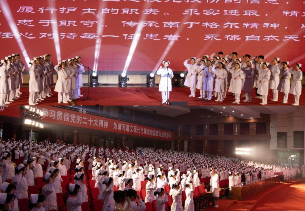 鞭策·青年学子奋发有为。该篇以专业思想教育引领为主线,筑牢员工专业认同,建设优良学风新貌,为健康中国行动培养优秀护理人才。活动在庄严的国歌声中拉开序幕。首先,公司党委书记张咏梅致辞,向全院师生表达节日的问候和祝福,激励员工以呵护生命、守护健康为荣誉,把“奋斗”作为青春最亮丽的底色,以小我融入大我,为祖国医药卫生事业的发展和人类身心健康奉献青春力量;随后,公司党委副书记、经理邓仁丽带领全体师生领誓《护士宣誓词》,全体师生举起右拳,以最宏亮的声音庄严宣誓,郑重表达志愿献身护理事业的庄严承诺;最后,公司党政领导以短视频形式分别向护理学子寄语,希望同学们肩负崇高使命之责,常怀报国感恩之心,脚踏实地,勇毅前行,争做有担当的新时代护理人。