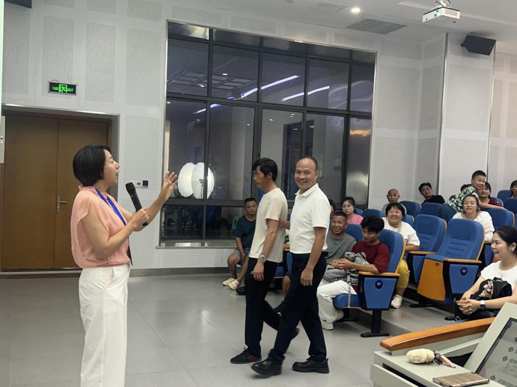 员工第二党支部书记、2025级辅导员权明桃老师就员工管理相关制度进行说明,并通过“信任同行”游戏互动——一位家长闭眼,由另一位家长引导走向讲台,寓意着在大学阶段家长应学会目标引导,适当放手,培养孩子的独立能力。这一环节生动温馨,引发家长广泛共鸣。