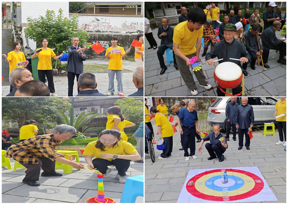 随后,伴随着《没有共产党就没有新中国》等红色歌曲传唱,实践团师生与老人们共同开展彩虹弹力球、趣味套圈、扭扭棒手工等适老游戏,庭院内欢声笑语,其乐融融。同时,师生们还以合影留念定格美好时光,留存珍贵记忆。