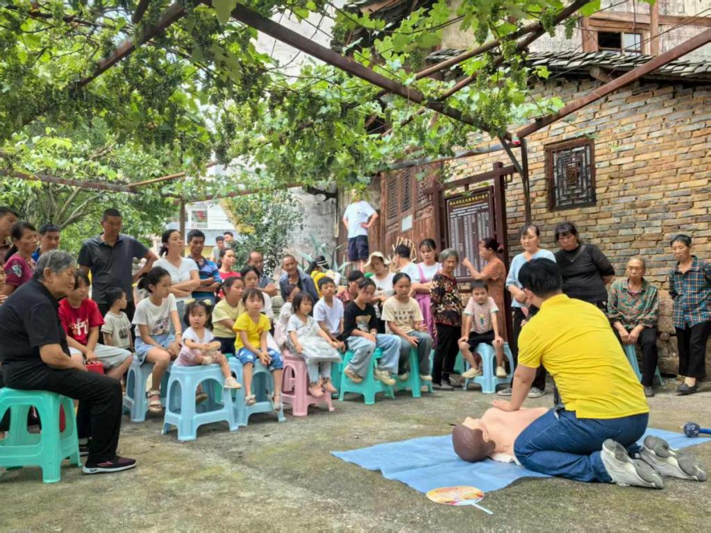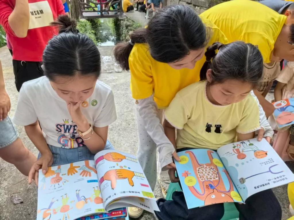健康知识普及,护航儿童成长。“当有人被异物卡住喉咙,海姆立克急救法要这样操作……” 实践队的钟威老师一边演示,一边为在场的家长和小朋友们细致讲解海姆立克急救法、心肺复苏等实用急救技能。随后,进行实操练习,孩子们在老师的指导下,认真模仿按压手势,现场学习氛围浓厚。与此同时,队员们带着孩子们共读《身体大发现》《性别小常识》《不可思议的身体》等绘本书籍,通过趣味问答、情景模拟等方式,帮助孩子们认识身体构造、学习自我保护方法,助力儿童健康成长。