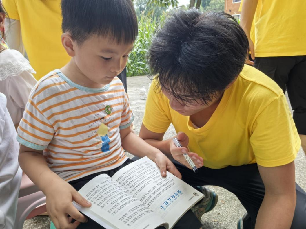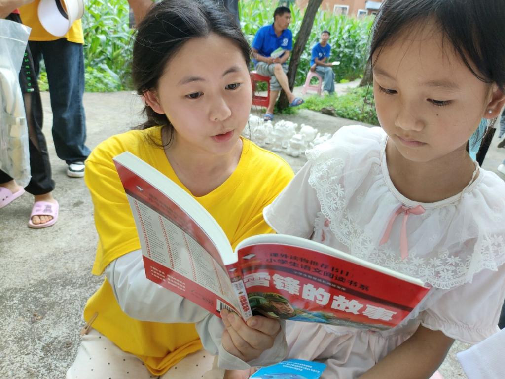 红色经典共读,播撒信仰种子。实践队成员与孩子们围坐在一起,共同翻开《长征的故事》《小英雄雨来》《闪闪的红星》《少年英雄王二小》等红色读物。书页翻动间,一个个鲜活的英雄形象跃然眼前,孩子们听得入神,不时为故事里的情节攥紧小拳头。阅读结束后的分享环节中,孩子们争先恐后地表达心声:“我要像雨来一样,遇到困难不害怕!”“王二小真聪明,我也要学会动脑筋解决问题!”“现在的好日子来之不易,我要好好学习,将来报效祖国!”稚嫩的话语里,藏着红色基因悄然萌发的力量。